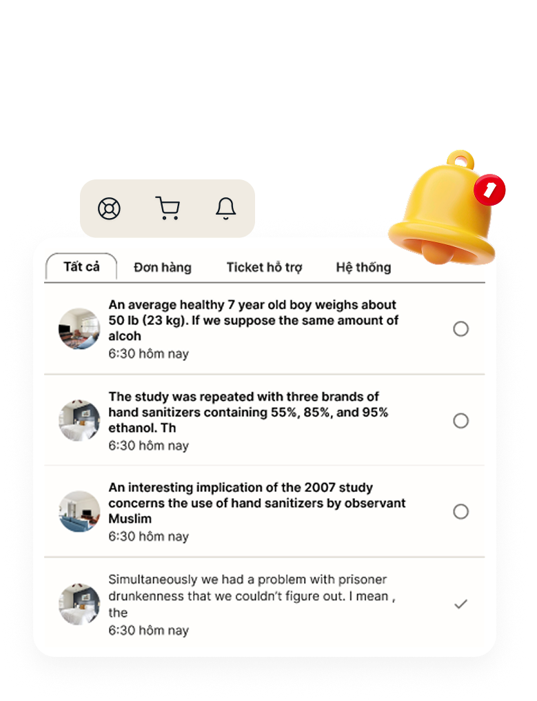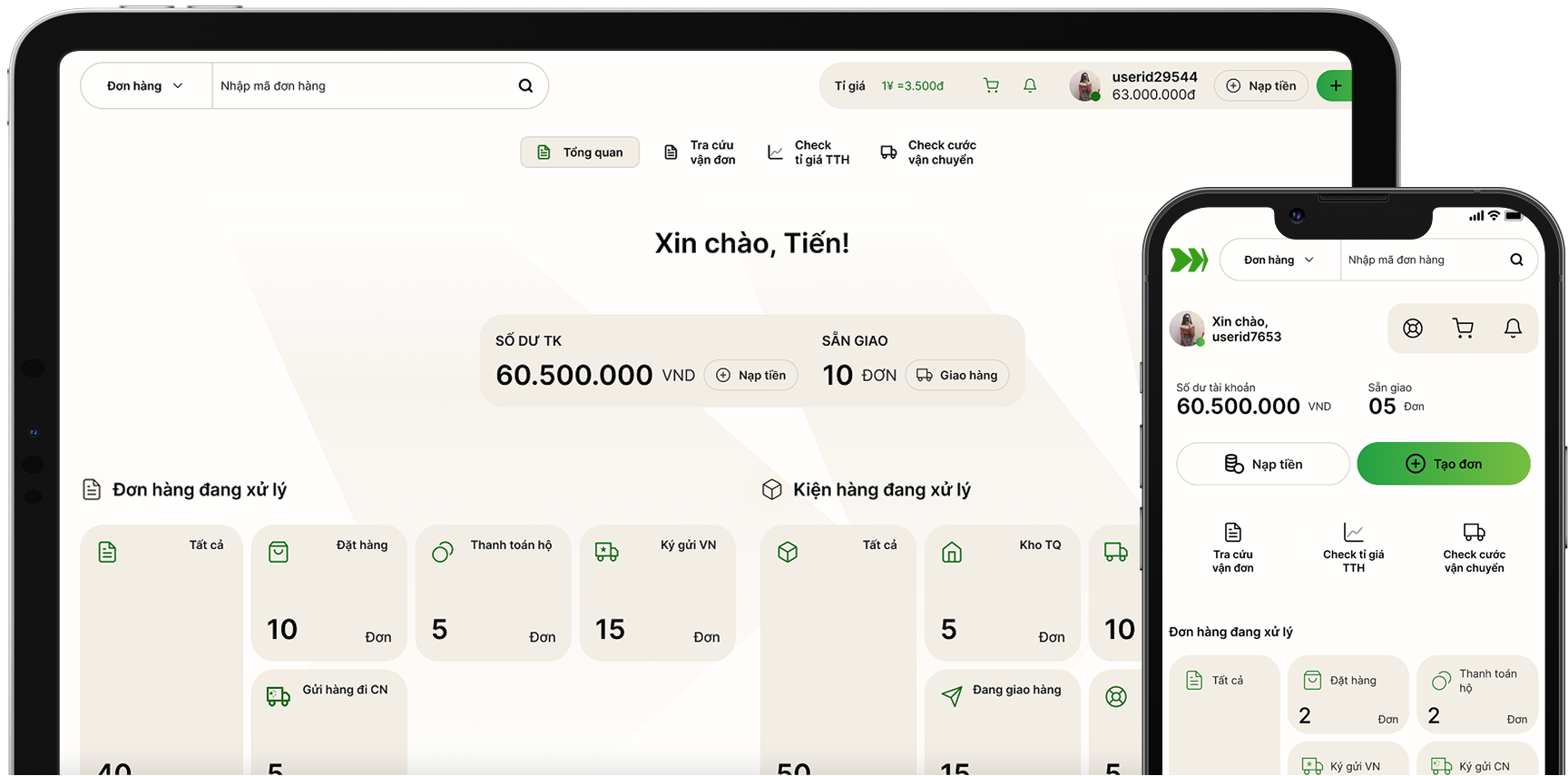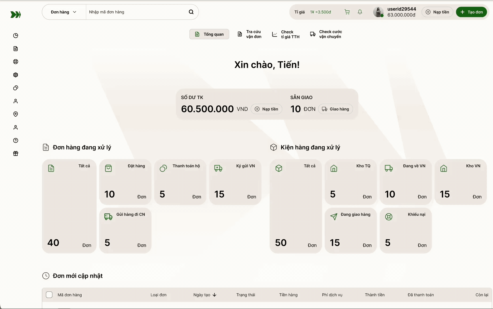 Hiển thị toàn bộ đơn hàng, ví, trạng thái, ưu đãi, cập nhật mới